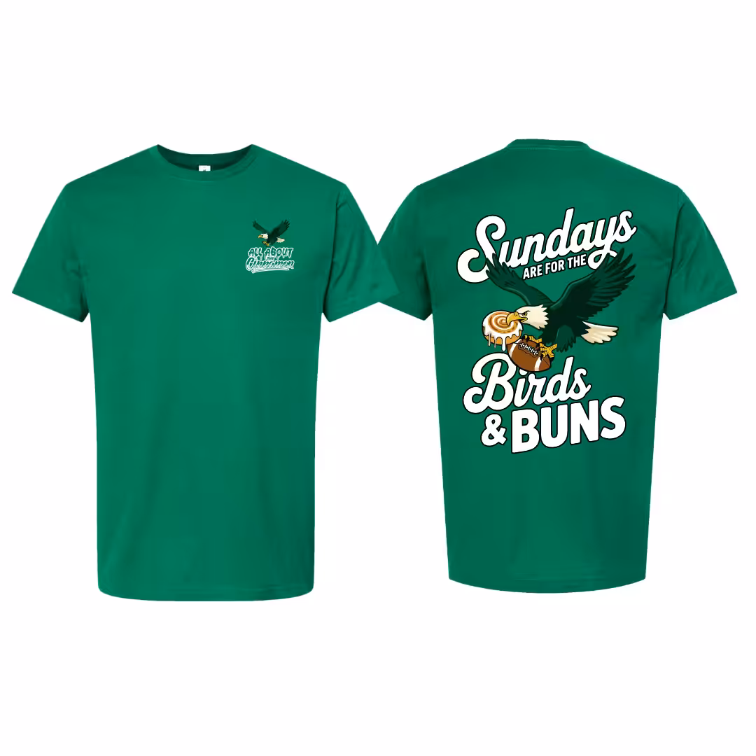 “Sundays are for the Birds & Buns” wraps around in bold letters. Kelly green like the legacy. 100% ringspun cotton for maximum comfort through all four quarters (and then some).