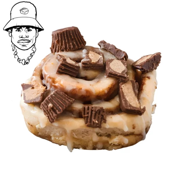 Our homemade, organic Cinnamon Bun topped with chunks of Reese’s peanut butter cups and our Reese’s peanut butter icing.
