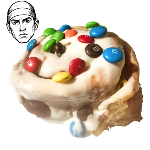 Our homemade, organic Cinnamon Bun with milk chocolate M&M candy sittin’ on top. Served with our organic cream cheese icing.