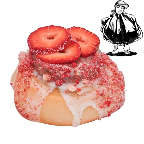 Our homemade, organic Cinnamon Bun topped with the realest strawberry shortcake crumbles and a scoop of fresh organic strawberries. Served with our organic cream cheese icing.